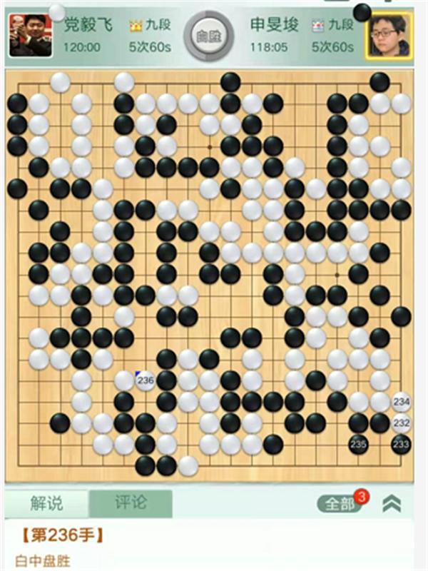 第一臺(tái)慢棋,由深圳隊(duì)的外援申旻埈九段執(zhí)黑對(duì)陣成都隊(duì)的世界冠軍黨毅飛九段。右下角白棋出現(xiàn)失誤,黑棋沒(méi)有抓住機(jī)會(huì)反而被白棋便宜不少。之后黑棋頑強(qiáng)追趕局面一度接近。但是官子階段黑棋始終沒(méi)有發(fā)現(xiàn)左上角官子便宜的小巧手,被白消除隱患后,白勝勢(shì)。申旻埈執(zhí)黑中盤負(fù)黨毅飛。