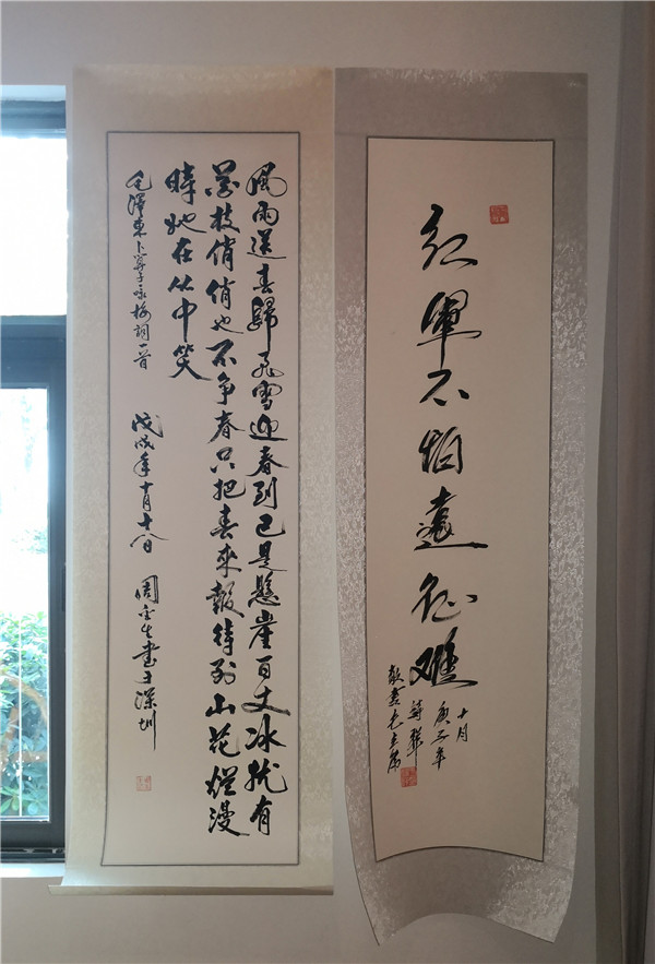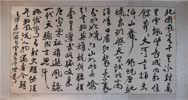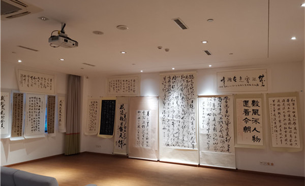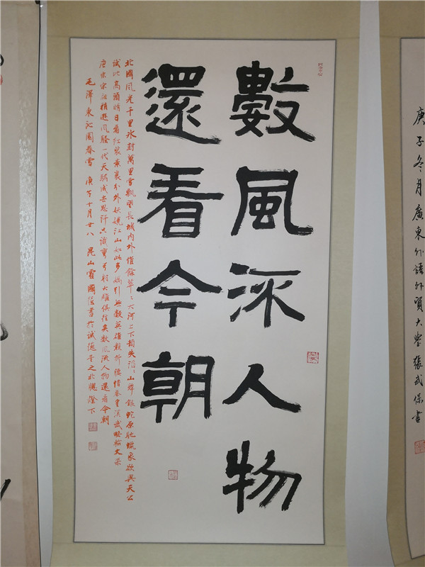 活動開始前,與會嘉賓在服務(wù)人員的引導(dǎo)下參觀了《毛澤東詩詞主題書法展》。展廳布置的作品有40余幅,全部內(nèi)容均為毛澤東同志在革命活動所創(chuàng)作的詩詞,或整篇書寫,或取其意。作品形式以橫幅、斗方、條幅、對聯(lián)為主,字體多為行草,間有楷書隸書,書寫者有企事單位的領(lǐng)導(dǎo)、干部和離退休人員。在這個特殊的日子里,他們以此形式緬懷毛主席的豐功偉績,表達(dá)內(nèi)心對毛澤東同志的敬意和懷念。