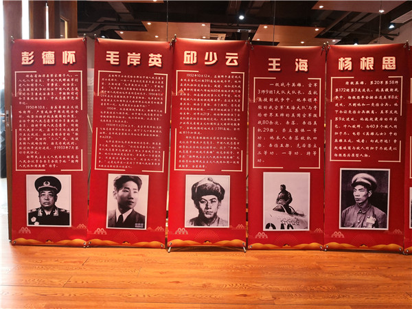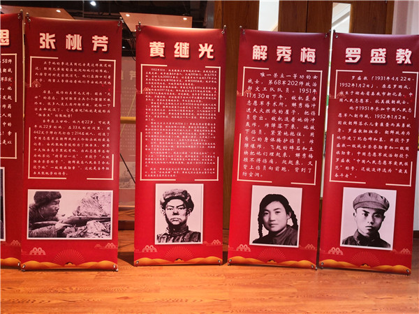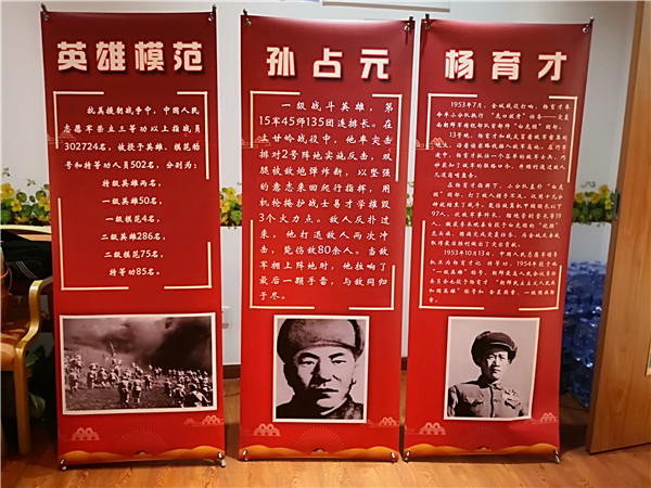 《抗美援朝十大英雄和著名戰(zhàn)役宣傳展》主要以展板形式陳列在活動現(xiàn)場四周,以便于到場的人學(xué)習(xí)參觀。據(jù)悉,在抗美援朝戰(zhàn)爭中,中國人民志愿軍榮立三等功以上指戰(zhàn)員有302724名,被授予英雄、模范稱號和特等功人員502名,其中:特級英雄兩名,一級英雄50名,一級模范4名,二級英雄286名,二級模范75名,特等功85名。本次宣傳展收集了十位最有影響的英雄,他們是:彭德懷、楊根思、黃繼光、解秀梅、孫占元、邱少云、楊育才、張?zhí)曳?、王海、羅盛教。著名戰(zhàn)役有:上甘嶺戰(zhàn)役、馬良山爭奪戰(zhàn)、橫城反擊戰(zhàn)、云山之戰(zhàn)……參觀之后,許多人為英雄人物的言行所感動,表示要傳承發(fā)揚抗美援朝不畏強權(quán)的英雄主義和革命精神。