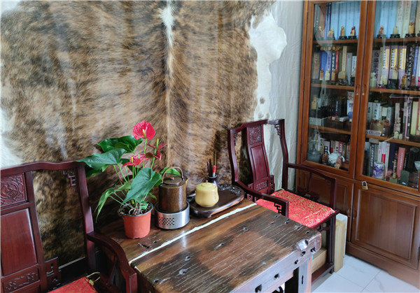 俗話說得好:見識(shí)一個(gè)素養(yǎng),看看他的書房就知道了!那么,寧起興老師的書房是什么樣的呢?第一印象:簡潔、古樸、有趣味。一眼掃去,臨窗一張紅木桌,兩個(gè)裝得滿滿的老書柜,兩張烏黑發(fā)亮的南官帽椅,中間配有一張老舊的喝茶的原木桌,正上方的墻面掛著一整張大大的南美阿根廷牛皮。墻上橫掃,掛有“室靜書馨”的書法作品,一張古琴,一把薩克斯,幾份有關(guān)他篆刻宣傳的剪報(bào),還有星星點(diǎn)點(diǎn)的各類鈴鐺。細(xì)看呢:書柜里的篆刻工具書,有大部頭的字典、印譜和系列叢書,也有與篆刻相關(guān)的文化類書籍,大多插滿了顏色各異的標(biāo)簽,可見寧老師讀書的細(xì)致與用心。紅木大桌上有一對大音箱,是原裝進(jìn)口的德國貨;桌子旁,有一正方形的小桌特別顯眼,寧老師帶著些許自豪的神態(tài)介紹說,鉗臺(tái)是德國進(jìn)口的,鋸子也是原裝進(jìn)口的,那個(gè)刻銅印的印盤是定制的。還有,他所用的刻刀頂端印有l(wèi)ogo,是小篆“寧”字與工字的合寫,該刀鋼材鈷含量為17%,也是定制的。正所謂“工欲善其事,必先利其器”,寧老師深以為然。是以,他在工具上追求“高精尖”甚至不惜工本。