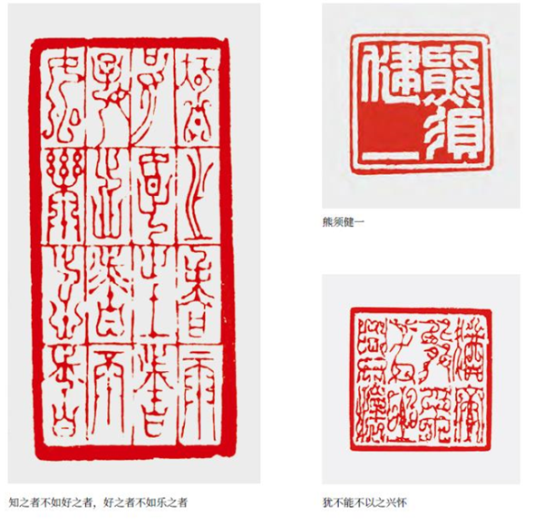 說起自己的代表作,寧老師十分謙虛,但筆者還從他的印屏、印作中,從以往宣傳報(bào)道中理出了一些頭緒。比如,剛來深圳,有感于鄧小平同志的功績,刻了一方《總設(shè)計(jì)師鄧小平》,陳巨來的印味明顯。2013年寶安區(qū)書法協(xié)會(huì)發(fā)行新年掛歷上印有“蛇年大吉”印章,便出自他手。那是一方金文白文印,整體舒朗開闊,靈動(dòng)高古,爛漫天成,不失為其代表作。還有,用一方印完整地刻出了268字的《心經(jīng)》亦是獨(dú)一無二的。他為友所刻《真善美》朱文鳥蟲篆,布局疏密自然,光潔妍美,婀娜多姿,韻味無窮。元朱文白文印《熊須健一》,疏密呼應(yīng),“一”字處大片留紅,與另三字形成強(qiáng)烈對比,“須”字三撇作美化處理,形成印眼。此印工穩(wěn)爽朗,行刀如筆,耐人尋味。還有應(yīng)約為著名棋手武宮正樹、徐瑩等所刻鳥蟲篆印均“嵌入”圍棋黑白二子的元素,自然貼切,又妙趣橫生。還有為出版社、書局、書籍插圖以及賽事配刻的印章更是數(shù)不勝數(shù)。當(dāng)前,寧老師依然精神飽滿、創(chuàng)作旺盛,相信未來還會(huì)不斷有令人驚喜的印品佳作問世。