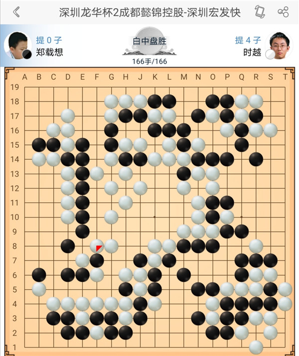 一臺(tái)快棋時(shí)越執(zhí)白對(duì)陣鄭載想。開(kāi)局黑棋打入左邊白棋模樣,之后黑棋棋形處理不佳,被白棋一路猛攻后損失慘重。之后白棋沒(méi)有再給黑棋機(jī)會(huì)活動(dòng)勝利。