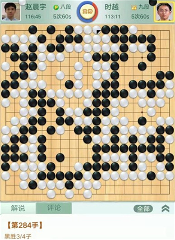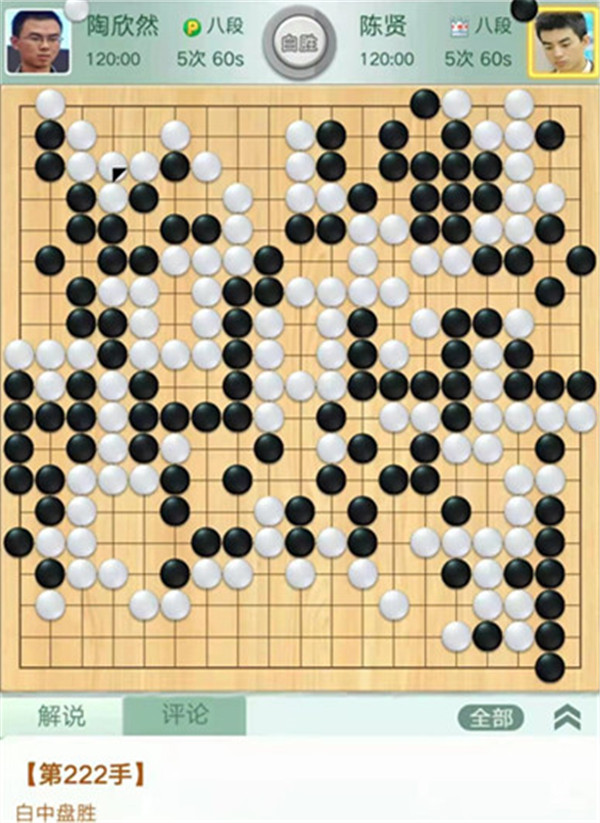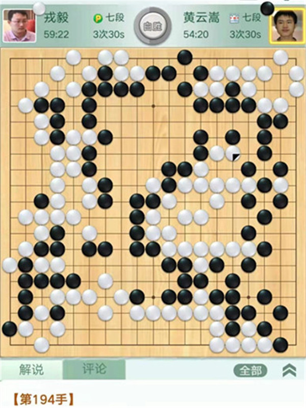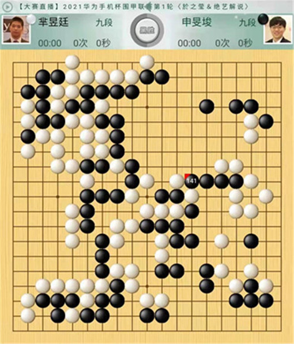 今日比賽中,申旻俊主將執(zhí)黑對陣新二冠羋昱廷,開局左上角申旻俊配合小米使出羋氏飛刀,結(jié)果是飛刀不成功黑棋局面領(lǐng)先。中盤黑棋攻擊中央白棋時,白棋脫先搶占實地。被黑手起刀落斬殺大龍,局終。快棋臺,去年屢立戰(zhàn)功的戎毅七段執(zhí)白對陣黃云嵩七段,行棋穩(wěn)健,占居三個角之后,又在中間活出一大塊,行棋至194手勝。三臺陶欣然八段對陣陳賢八段,行棋222手白中盤勝。四臺時越九段對趙晨宇一戰(zhàn),行至284手,以四分之三子微弱優(yōu)勢取勝。