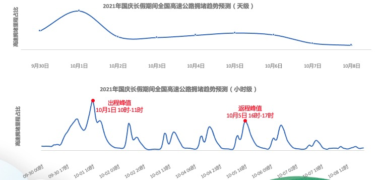 《預(yù)測(cè)》顯示,受國(guó)慶假期高速免費(fèi)通行以及出行需求集中的影響,預(yù)計(jì)2021年9月30日13時(shí)開(kāi)始,全國(guó)高速交通壓力將逐漸增大,21時(shí) -10月1日1時(shí)全國(guó)高速會(huì)有短時(shí)出行小高峰,10月1日9時(shí) -12時(shí)為高速出程高峰時(shí)段,峰值將出現(xiàn)在10時(shí) -11時(shí)。