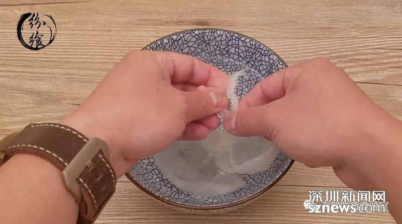 經(jīng)過3~5小時的浸泡后,燕窩已經(jīng)完全泡開。此時用一把小鑷子,將泡發(fā)出的細(xì)碎的燕毛等雜質(zhì)挑出來,清洗干凈泡開的燕窩。