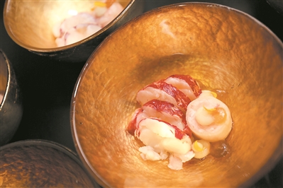 頭盤 “荷塘魚趣”,主角黃花魚來(lái)自世界第三大江——長(zhǎng)江。步步生蓮是東方禪意,蓮子依依是情誼,蓮藕結(jié)結(jié)是路路通達(dá),Alvin Leung此次演繹的中式料理充滿東方元素,表達(dá)的是和諧交融。主菜“日式鮮味香烤和牛”是日本主廚Hisamitsu Hataji 之作,他用創(chuàng)新手法融入經(jīng)典的日式料理中,表達(dá)一年四季食材與味道的關(guān)系,這是關(guān)于美食的光陰的故事。甜品出自Clement之手,是晚宴甜蜜的句號(hào)。