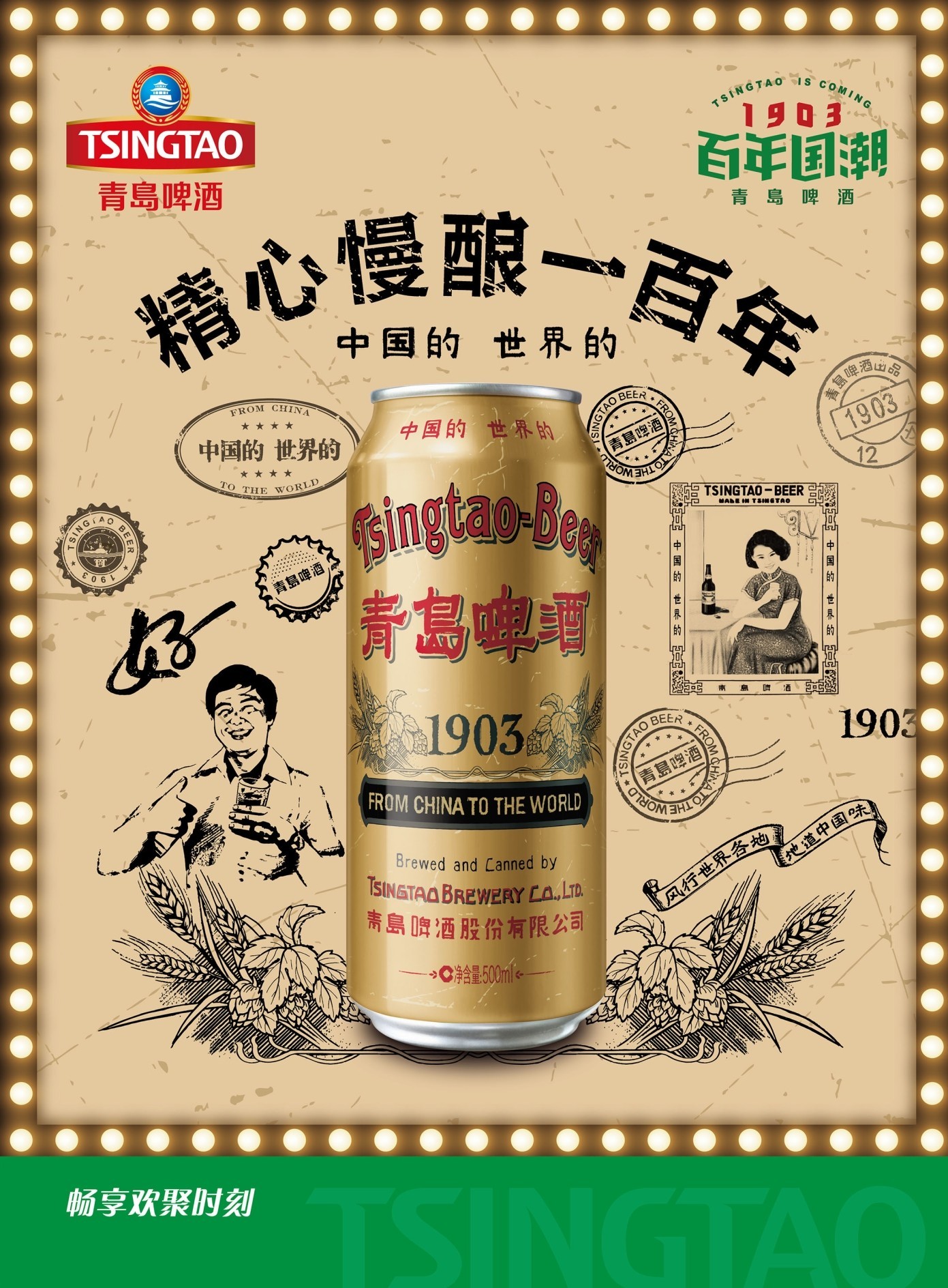 經(jīng)典1903國潮罐是青島啤酒“向經(jīng)典致敬,再造精釀傳奇”理念下推出致敬經(jīng)典的力作,采用青島啤酒1903年“兩段法低溫長時間慢熟”獨特且傳統(tǒng)的釀造工藝,始終堅持工匠精神,從原料篩選到工藝釀造的每一個環(huán)節(jié),都像雕琢藝術(shù)品一樣精致打磨,精心慢釀,造就了麥香濃郁醇香四溢的口感和體驗,其罐體復(fù)刻了百年前經(jīng)典瓶貼畫面的匠心細(xì)節(jié),復(fù)古元素與國際時尚潮流融于一體,是復(fù)古和時尚的典范。