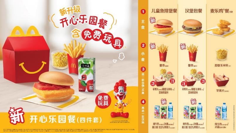 在確保產(chǎn)品美味與質(zhì)量的前提下,麥當(dāng)勞一直致力于實現(xiàn)更少鹽、更好油、更多蔬果谷物。新開心樂園餐參考了“麥當(dāng)勞全球兒童營養(yǎng)標(biāo)準(zhǔn)”,并充分考慮了中國兒童的膳食營養(yǎng)需求。新套餐從三件套升級為四件套,包括一份主食 (可選肉類蛋白來源:魚、牛、雞)、一份小食 (可選迷你薯條、玉米杯)、一份蔬果 (可選蘋果片、鮮蔬杯、玉米杯)和一份飲品 (可選純牛奶、水、100%蘋果汁 )。