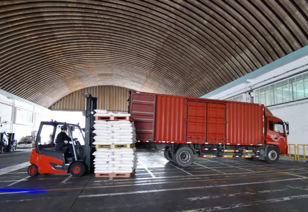 南海糧食員工將向武漢捐贈的面包專用粉裝車