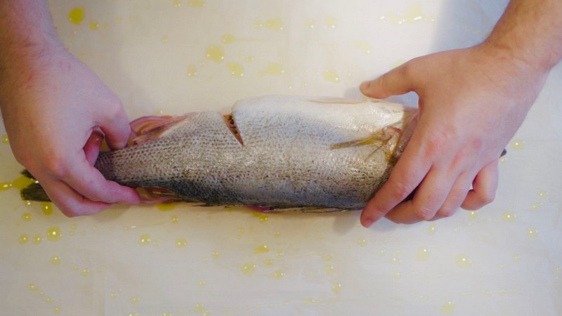 3、在牛油紙內(nèi)倒入橄欖油,將鱸魚放在洋蔥和羅馬番茄上;