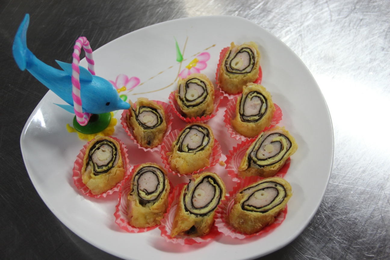 做法:將鮮蝦去殼拆肉,用菜刀輕輕碾壓之后,加入少量精鹽拌勻,于鋁制小碗中不停搓攪。打蝦膠時(shí)手必須朝同一方向攪拌,這樣蝦肉才會(huì)粘連起膠;否則卻可能破壞粘度,口感亦不夠爽脆。然后,打碎雞蛋,于平底鍋中烙出一塊塊金黃色雞蛋皮,并連同大片紫菜各各切成正方形片狀。將紫菜片放于雞蛋皮上,取蝦膠均勻涂抹于紫菜表面,蓮子整齊擺放于一端,以其為圓心卷裹成圓條。整條放入中溫油鍋,微炸至表面金黃即撈起瀝油,斜刀切成厚片直接裝盤。