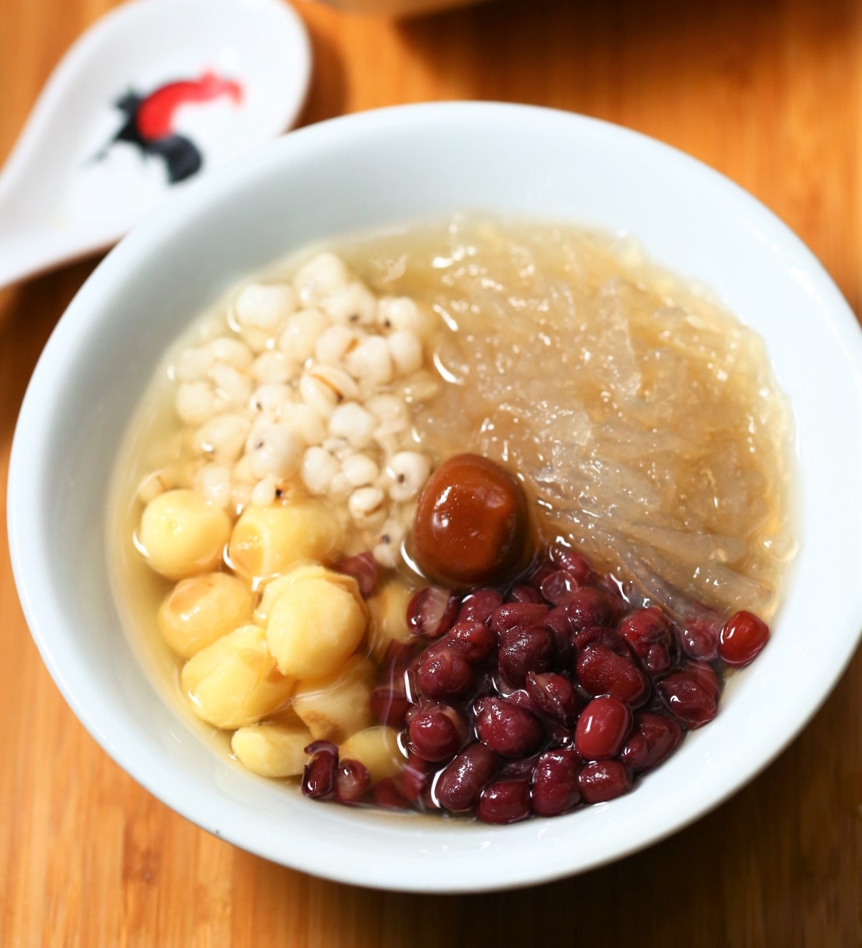 做法:將蓮子、紅豆和薏米各自煮到口感綿密;海石花是潮汕地區(qū)的一種特色食材,刨絲以后,加上此前已煮好的蓮子、紅豆、薏米、冬瓜茶和些許白砂糖,即可食用。