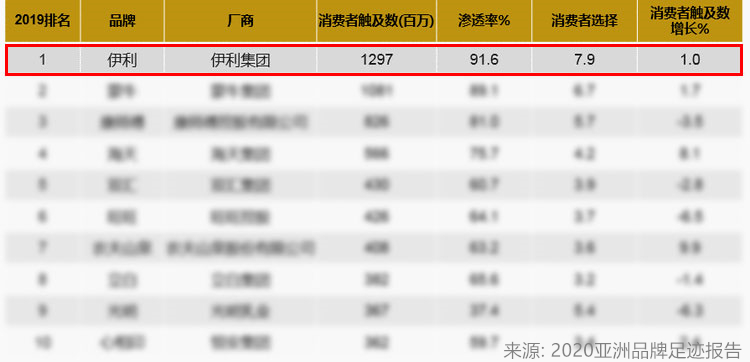 見圳客戶端·深圳新聞網(wǎng)2020年6月23日訊 日前,凱度消費(fèi)者指數(shù)發(fā)布了《2020亞洲品牌足跡報(bào)告》。伊利憑借91.6%的品牌滲透率、近13億的消費(fèi)者觸及數(shù)和近8次的購買頻次,連續(xù)五年位列中國市場(chǎng)消費(fèi)者選擇最多的品牌榜首。綜合報(bào)告數(shù)據(jù)顯示,伊利各項(xiàng)指標(biāo)在榜單中領(lǐng)先于其他品牌,持續(xù)領(lǐng)跑中國快消品市場(chǎng)。