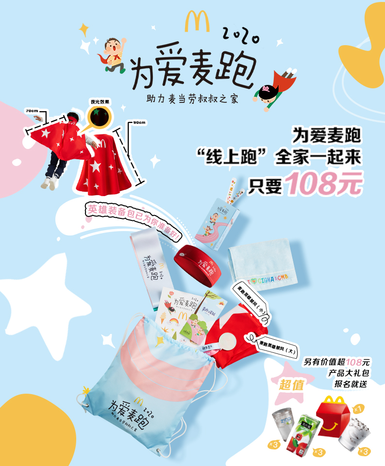 不同于往年大規(guī)模的線下親子跑,今年“為愛麥跑”采用創(chuàng)新的“線上愛心親子跑”,提供裝備包和任務(wù)盒,讓參跑家庭用不聚集、無接觸的形式參與跑步,享受親子時(shí)光,并支持麥當(dāng)勞叔叔之家。“為愛麥跑”鼓勵(lì)參跑者發(fā)揮創(chuàng)意,以家庭為單位設(shè)定自己的路線和距離,例如以自己的家為起點(diǎn),將終點(diǎn)設(shè)在附近的麥當(dāng)勞餐廳。