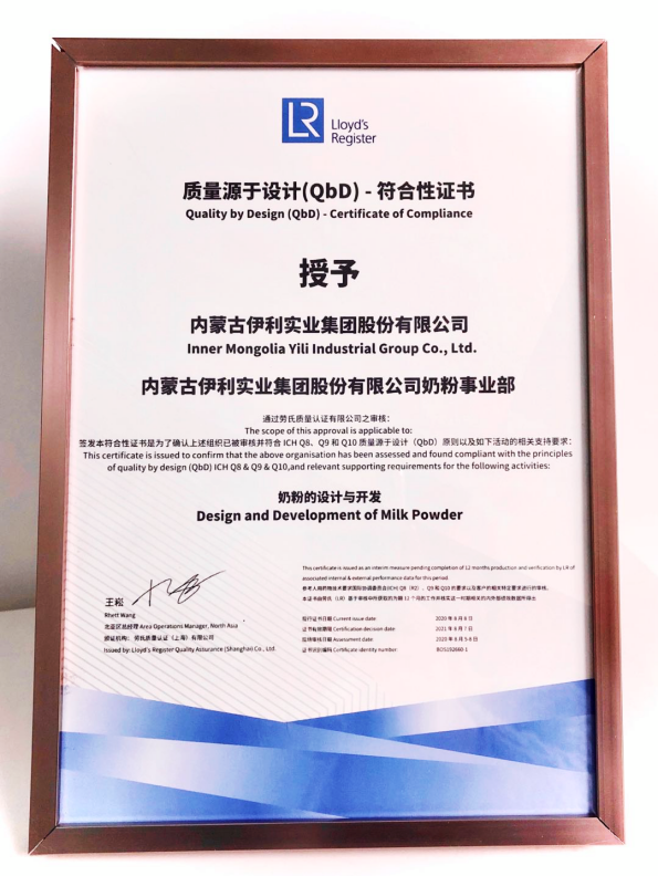 伊利獲頒食品行業(yè)首個QbD認(rèn)證