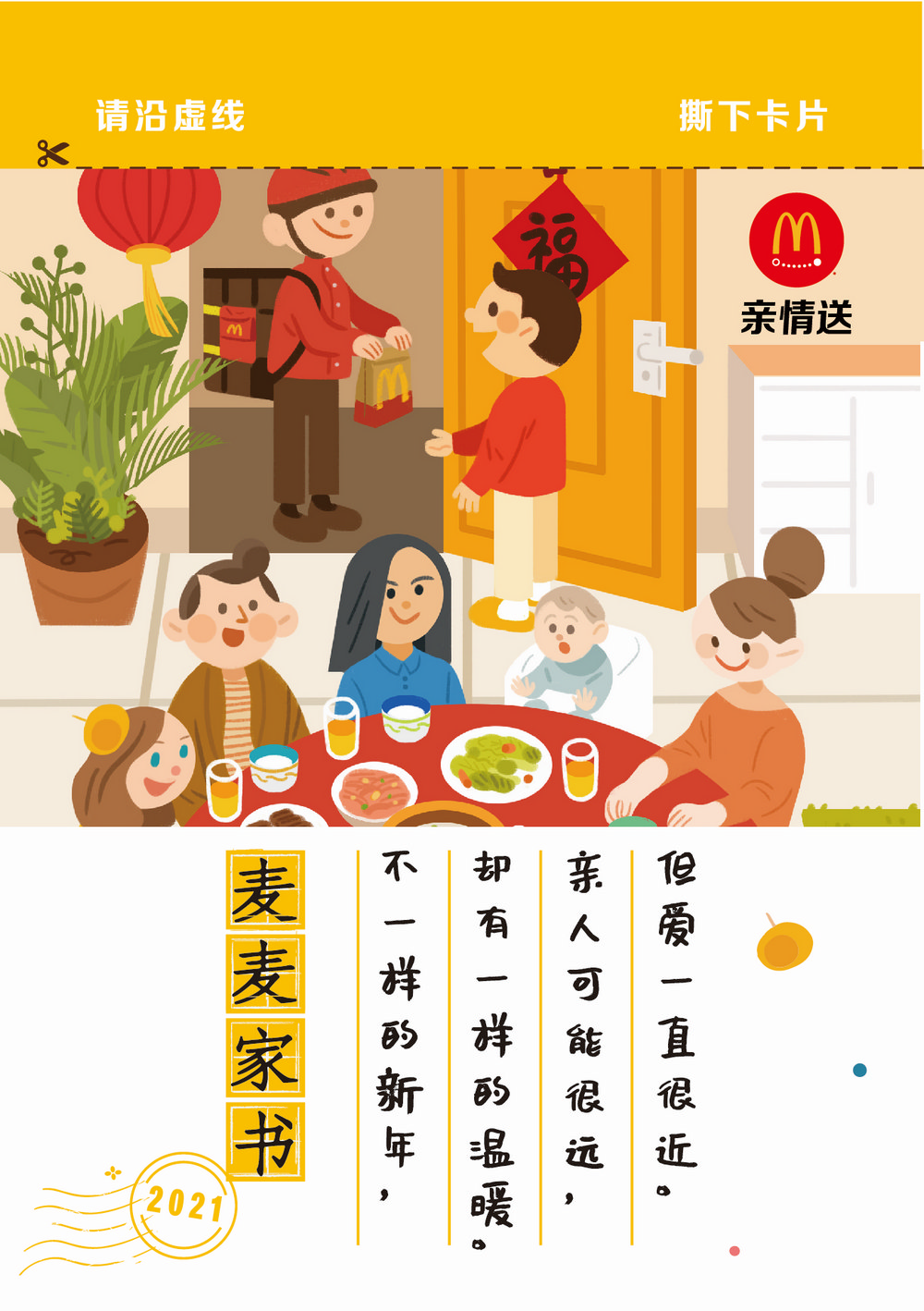 2021年春節(jié),麥當勞希望與各地員工、外送員和消費者一起“共此時”,通過【放心+】全方位安全服務、關愛行動和多重福利,向他們奉上滿滿誠意和暖意,一起過個別樣新年。這個團年飯,你我共此時!