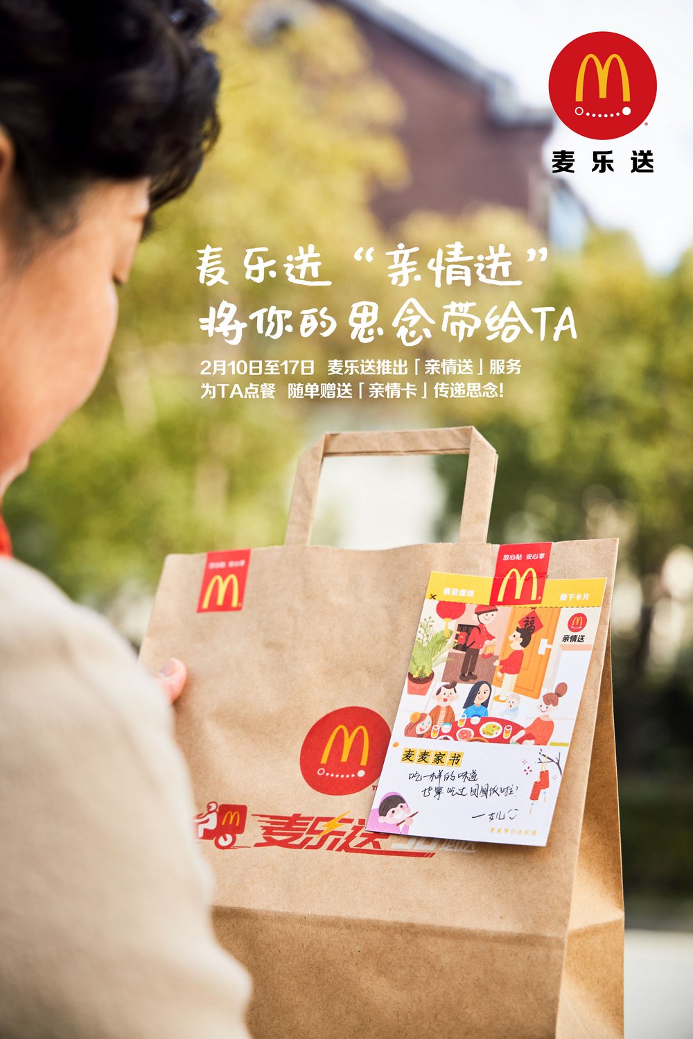 為了讓分隔兩地的顧客表達對彼此的思念和祝福,麥樂送于春節(jié)期間推出“親情送”服務。2月10日至2月17日,在i麥樂送小程序、麥當勞App、美團麥當勞店鋪、餓了么麥當勞店鋪,顧客可以選擇“親情送”服務,為遠在異地的親人朋友點餐,麥樂送會在訂單中附上【親情卡】,消費者可以定制祝福,卡片連同美食將一齊送達你思念的人手中。