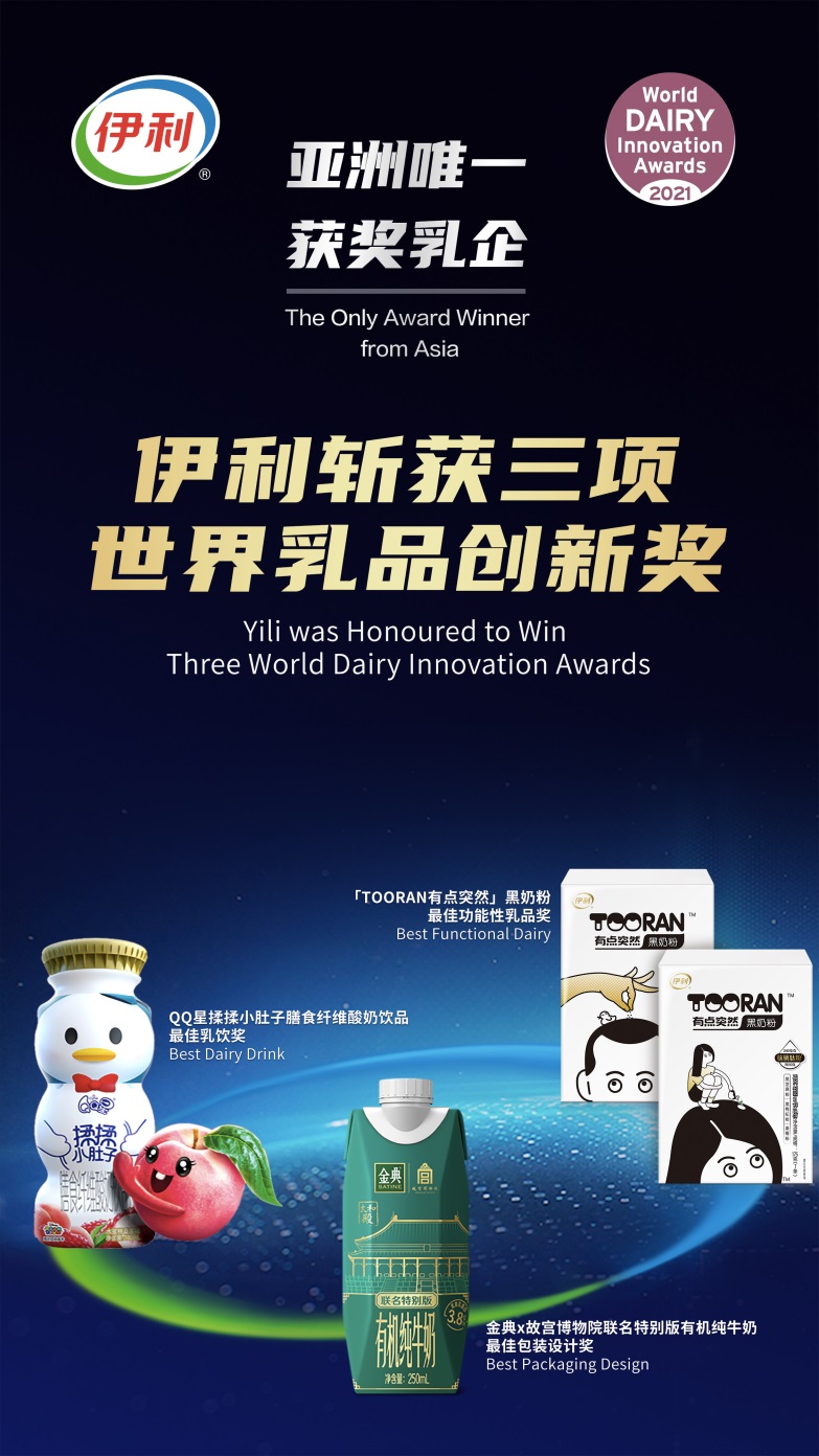 作為全球乳業(yè)的創(chuàng)新風(fēng)向標(biāo),世界乳品創(chuàng)新獎(jiǎng)?wù)故玖巳蛉槠笤趧?chuàng)新方面取得的重要成果,本屆共有來自25個(gè)國(guó)家、20個(gè)類別的222個(gè)作品參賽。憑借領(lǐng)先的創(chuàng)新實(shí)力,伊利旗下產(chǎn)品獲得三項(xiàng)大獎(jiǎng):QQ星揉揉小肚子膳食纖維酸奶飲品獲得最佳乳飲獎(jiǎng)、「TOORAN有點(diǎn)突然」黑奶粉獲得最佳功能性乳品獎(jiǎng)、金典x故宮博物院聯(lián)名特別版有機(jī)純牛奶獲得最佳包裝設(shè)計(jì)獎(jiǎng)。