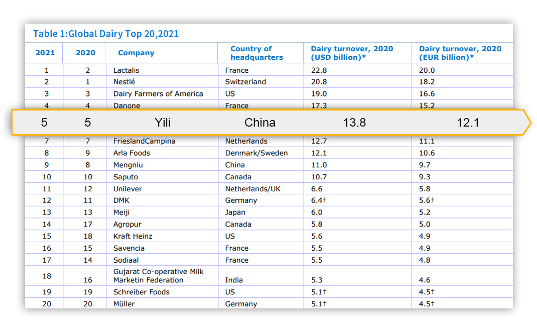 伊利蟬聯(lián)全球乳業(yè)五強、連續(xù)8年穩(wěn)居亞洲乳業(yè)第一