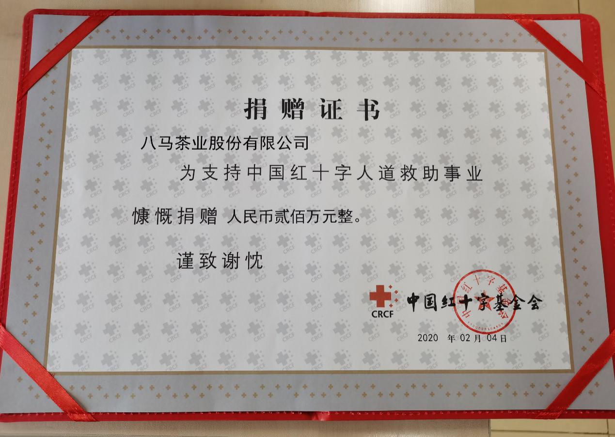 八馬茶業(yè)向中國紅十字基金會捐贈(zèng)人民幣200萬元,用于支援新型冠狀病毒感染的肺炎疫情防控及防疫一線醫(yī)務(wù)人員發(fā)放人道救助金等工作。