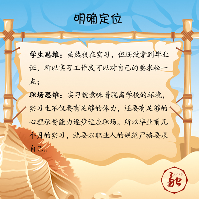 職場思維:實(shí)習(xí)就意味著脫離學(xué)校的環(huán)境,實(shí)習(xí)生不僅要有足夠的體力,還要有足夠的心理承受能力逐步適應(yīng)職場。畢業(yè)前幾個(gè)月的實(shí)習(xí),就要以職業(yè)人的規(guī)范嚴(yán)格要求自己。