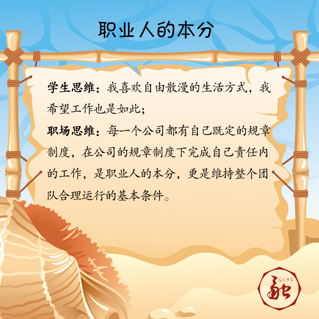 職場思維:每一個(gè)公司都有自己既定的規(guī)章制度,在公司的規(guī)章制度下完成自己責(zé)任內(nèi)的工作,是職業(yè)人的本分,更是維持整個(gè)團(tuán)隊(duì)合理運(yùn)行的基本條件。