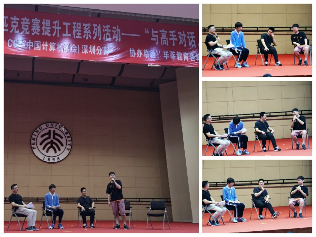 本次活動除了邀請周楷文同學(xué)親臨現(xiàn)場之外,還邀請了雅禮中學(xué)正高級教師,為雅禮貢獻(xiàn)了9塊IOI金牌的朱全民老師;北京大學(xué)深圳研究生院計算機(jī)專業(yè)雷凱副教授;雅禮中學(xué)畢業(yè),通過信息學(xué)競賽保送到北京大學(xué)信息科學(xué)與技術(shù)學(xué)院計算機(jī)專業(yè)就讀本科以及研究生的章嘉晨同學(xué),國際大學(xué)生信息學(xué)競賽(ICPC)區(qū)域賽金獎、報送北京大學(xué)深圳研究生院就讀計算機(jī)專業(yè)的陳銳彪同學(xué)。
