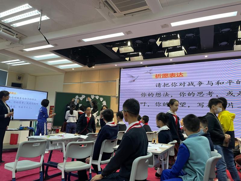 上午8:30分,益田小學(xué)一樓禮堂內(nèi)首先進行室內(nèi)升旗儀式,在場師生滿懷祭奠之情,為受難者默哀一分鐘,致敬逝者,寄托民族哀思。接著,四(3)班中隊表演了相關(guān)詩朗誦以及“銘記歷史,努力學(xué)習(xí)宣誓“活動,最后,益田小學(xué)名師、福田區(qū)品牌課程主持人嚴(yán)霞老師帶領(lǐng)學(xué)生上了一節(jié)別開生面的思政課 《和平是什么》,嚴(yán)老師通過閱讀相關(guān)繪本和文字,以及學(xué)生喜聞樂見的講故事、繪本閱讀、觀看視頻等多樣的教學(xué)方式,引導(dǎo)學(xué)生了解公祭日的由來,思考、感知戰(zhàn)爭的慘痛與和平的可貴,時刻謹(jǐn)記中國遭受過的屈辱歷史決不能重演!