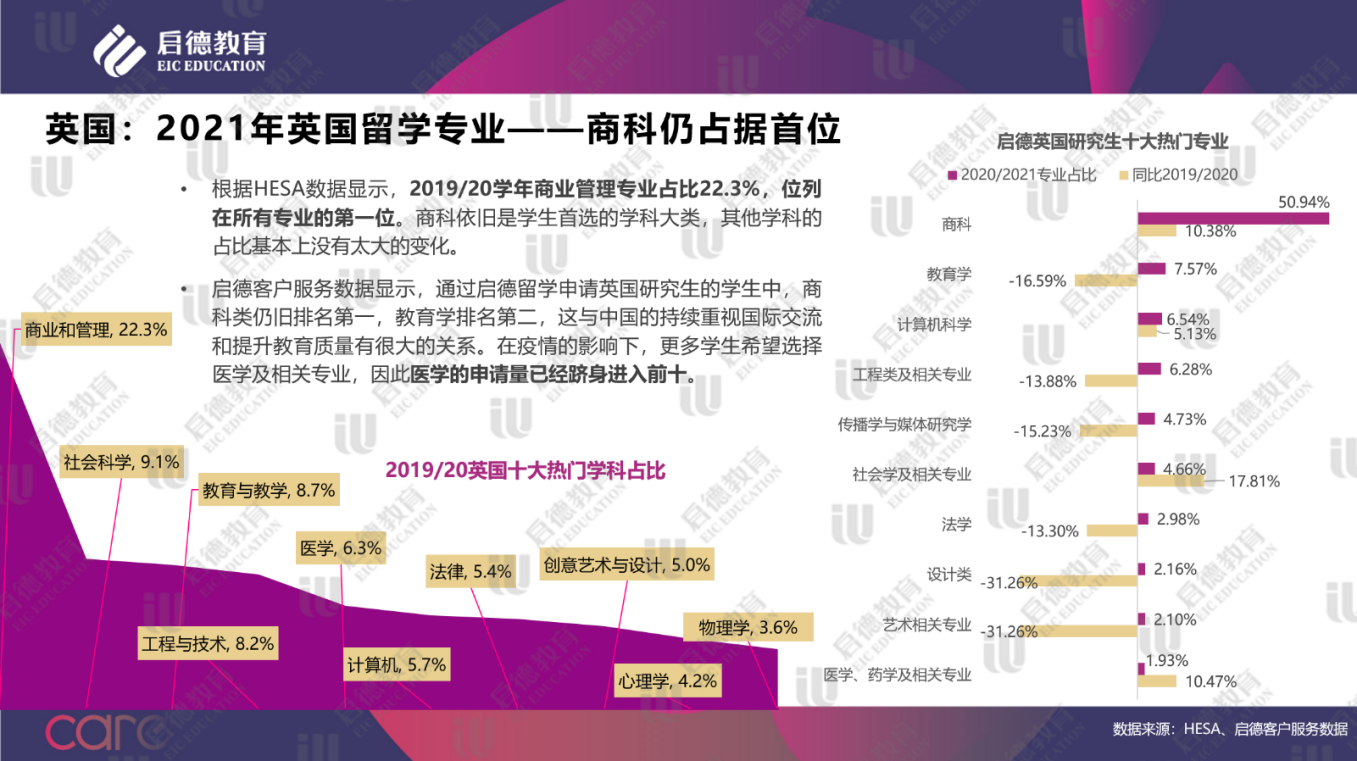 長(zhǎng)期以來(lái),由于其廣闊的就業(yè)前景,F(xiàn)AME專業(yè)(金融、會(huì)計(jì)、管理、經(jīng)濟(jì))和STEM專業(yè)(科學(xué)、技術(shù)、工程和數(shù)學(xué))一直備受留學(xué)生的青睞。2021 《美國(guó)門戶開放報(bào)告》數(shù)據(jù)顯示,半數(shù)以上的中國(guó)內(nèi)地學(xué)生就讀STEM專業(yè)(物理/自然科學(xué)、工程學(xué)、醫(yī)療健康、數(shù)學(xué) /計(jì)算機(jī) ),16.6%就讀商業(yè)與管理專業(yè)。英國(guó)高等教育統(tǒng)計(jì)局 HESA數(shù)據(jù)顯示,2019/20學(xué)年商業(yè)管理專業(yè)占比為22.3%,位列在英國(guó)研究生專業(yè)的第一位,其他依次為:社會(huì)科學(xué)、教育與教學(xué)、工程與技術(shù)、醫(yī)學(xué)、計(jì)算機(jī)、法律、創(chuàng)意藝術(shù)與設(shè)計(jì)、心理學(xué)以及物理學(xué)。