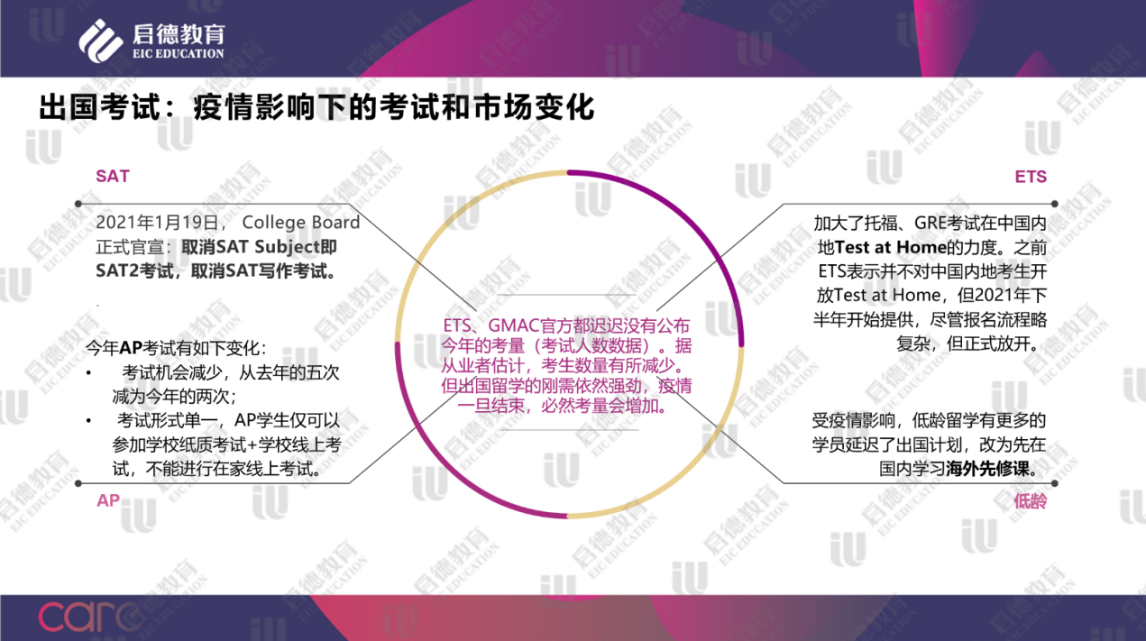 與此同時(shí),國(guó)產(chǎn)疫苗被海外多國(guó)認(rèn)可。此外,各種跡象表明,作為最主要的留學(xué)語(yǔ)言,2021年英語(yǔ)考試認(rèn)證已放寬,考點(diǎn)也在增多。除了日本37所知名院校開展全英文授課外,韓國(guó)也可用英語(yǔ)成績(jī)遞交申請(qǐng),法國(guó)提供1700個(gè)左右的英文授課課程,荷蘭碩士英語(yǔ)授課覆蓋率為95%,英語(yǔ)普及率在全世界非英語(yǔ)母語(yǔ)國(guó)家中最高。2021年1月19日,College Board正式宣布取消SAT Subject即SAT2考試,取消SAT寫作考試。2021年下半年 ETS對(duì)中國(guó)內(nèi)地考生開放Test at Home。同年,BC也在加快在中國(guó)內(nèi)地的雅思機(jī)考考點(diǎn)建設(shè)速度,計(jì)劃2022年將雅思機(jī)考考點(diǎn)覆蓋內(nèi)地四十多個(gè)城市。