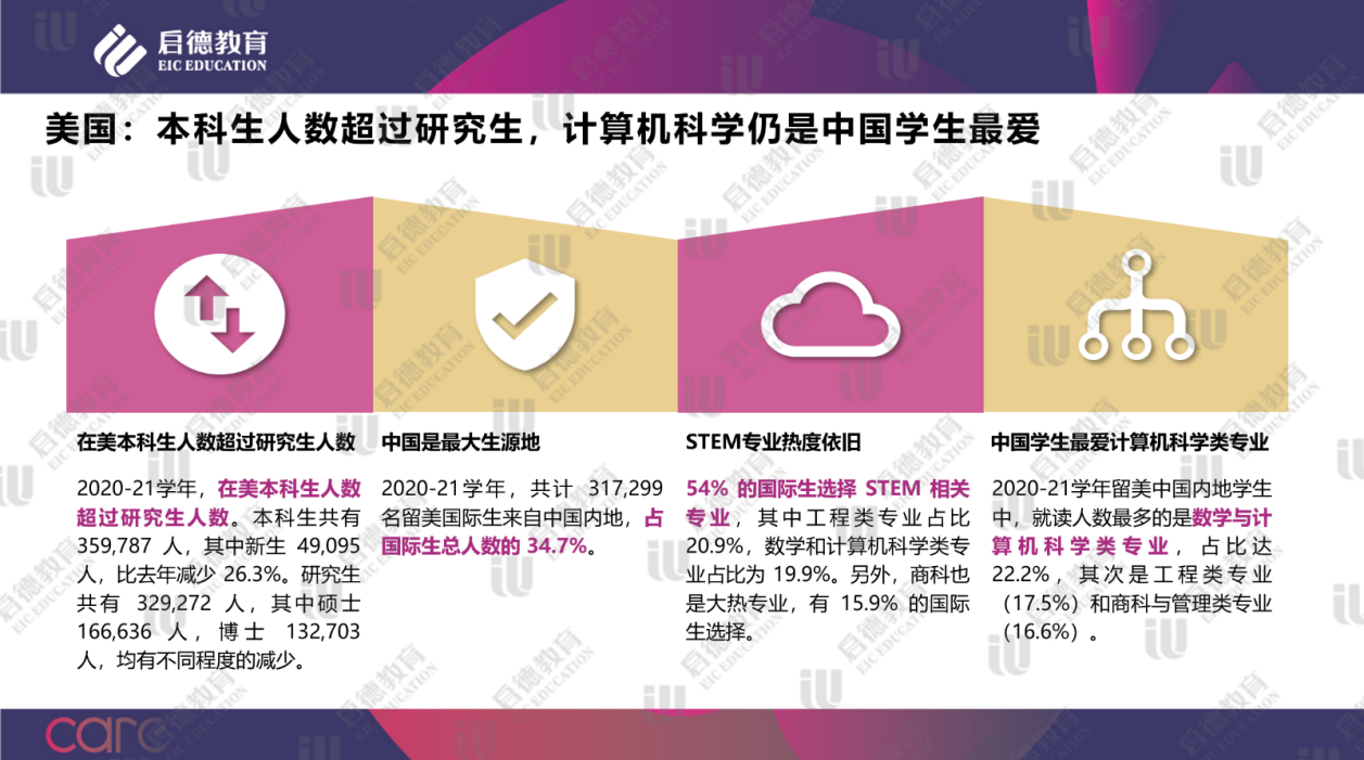 據(jù)2021 《美國(guó)門戶開放報(bào)告》數(shù)據(jù)顯示,2020/21學(xué)年共有914,095名國(guó)際學(xué)生在美國(guó)高等教育機(jī)構(gòu)學(xué)習(xí),中國(guó)內(nèi)地(317,299人)依舊是美國(guó)最大的生源地區(qū),在國(guó)際學(xué)生中占比為34.7%,其中本研占比分別是39.6%與37.5%。