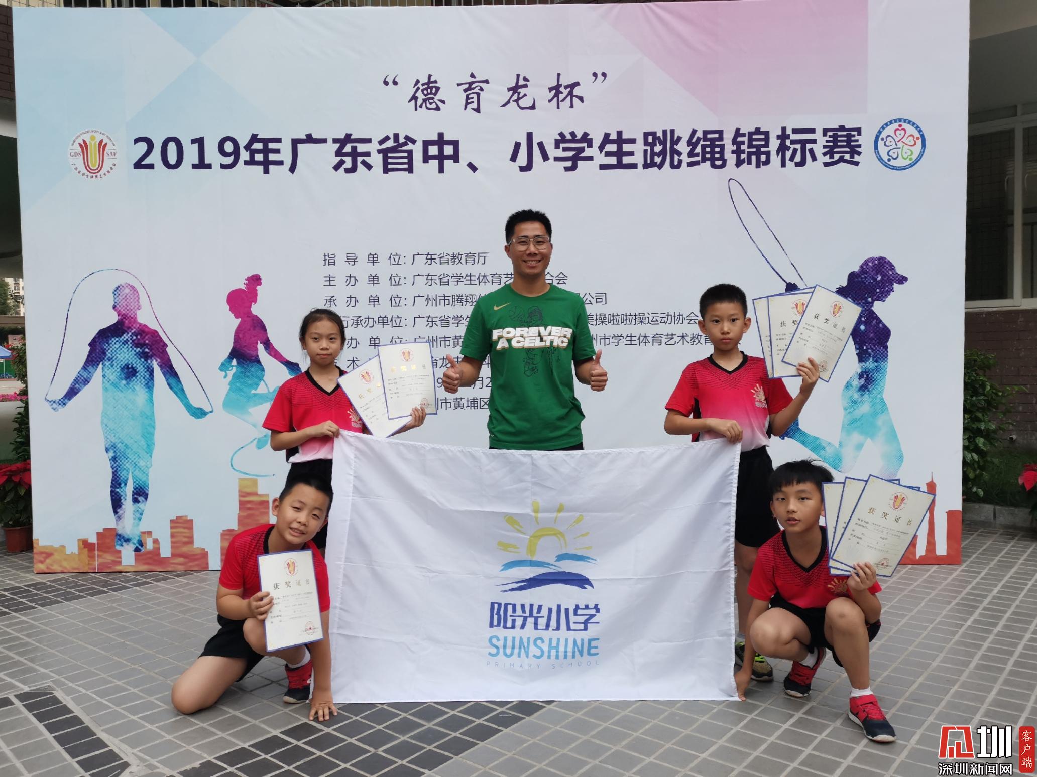 11月22—24日,2019年廣東省中、小學(xué)生跳繩錦標(biāo)賽在廣州黃埔區(qū)東薈花園小學(xué)舉行,深圳市南山區(qū)陽光小學(xué)林鑫輝、鄒相君、周昊宇、胡曉楠四位同學(xué)摘得2金1銅的好成績。