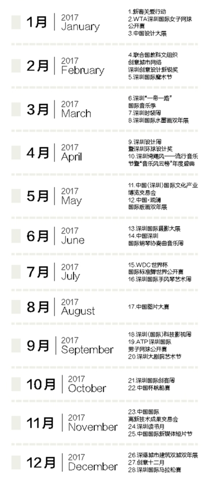 往細(xì)里說(shuō),“城市文化菜單”呈現(xiàn)出鮮明亮點(diǎn):一是國(guó)際化程度高。大部分活動(dòng)都有國(guó)際權(quán)威和國(guó)家級(jí)專業(yè)機(jī)構(gòu)主辦或授權(quán)支持,不少活動(dòng)代表了我國(guó)這一領(lǐng)域的最高水準(zhǔn),是可以代表深圳國(guó)際化城市形象的“文化大餐”。二是內(nèi)容豐富多彩。這份“菜單”表面上看只有28項(xiàng),實(shí)際上每項(xiàng)活動(dòng)時(shí)間跨度從幾天到一個(gè)多月不等,由十?dāng)?shù)項(xiàng)甚至上百項(xiàng)活動(dòng)組成,各款“菜式”都有,不同口味的人都可以自行“看單點(diǎn)菜”。三是體現(xiàn)深圳特色?!安藛巍敝杏腥种坏幕顒?dòng)與創(chuàng)新創(chuàng)意有關(guān),正好體現(xiàn)了深圳“創(chuàng)新之城”、“設(shè)計(jì)之都”的城市特性,可謂是深圳的文化“特產(chǎn)”。四是新的品牌活動(dòng)首次集體亮相。經(jīng)過(guò)多年培育,深圳已經(jīng)擁有文博會(huì)、高交會(huì)、讀書月、創(chuàng)意12月等傳統(tǒng)品牌活動(dòng),接下來(lái)還要精心打造一系列新的文化品牌活動(dòng)。在這份“菜單”中,2016年及今年新創(chuàng)辦的就有深圳“一帶一路”國(guó)際音樂(lè)季、深圳國(guó)際科技影視周、深圳國(guó)際攝影大展、深圳設(shè)計(jì)周、中國(guó)圖片大賽等多項(xiàng)活動(dòng),文博會(huì)、新春關(guān)愛行動(dòng)、國(guó)際魔術(shù)節(jié)等老牌活動(dòng)也都將有新的策劃、新的提升,更具國(guó)際化內(nèi)涵。一句話,這份菜單共匯集了國(guó)際化、標(biāo)志性的品牌文化活動(dòng)28項(xiàng),涵蓋文化藝術(shù)、創(chuàng)意設(shè)計(jì)、科技創(chuàng)新、體育休閑等多個(gè)類別,是廣義的文化活動(dòng)的概念。