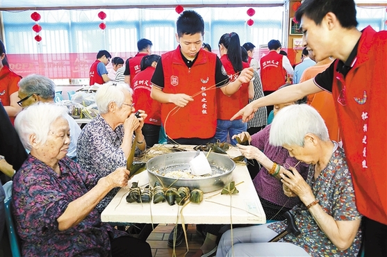 今年端午節(jié),市義工聯(lián)的義工們來到福田區(qū)福利中心,與老人一起進(jìn)行包粽子比賽,在輕松快樂的氣氛中陪伴老人們過端午。 本報資料照片