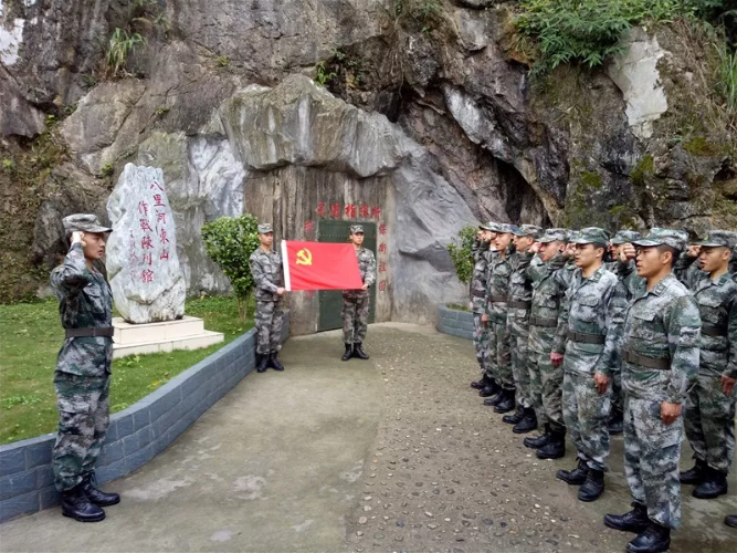 巖石旁,南部戰(zhàn)區(qū)陸軍某邊防旅“鋼七連”升起的國旗迎風招展,與鮮紅的大字交相輝映。戰(zhàn)壕軍史館就坐落于此處。