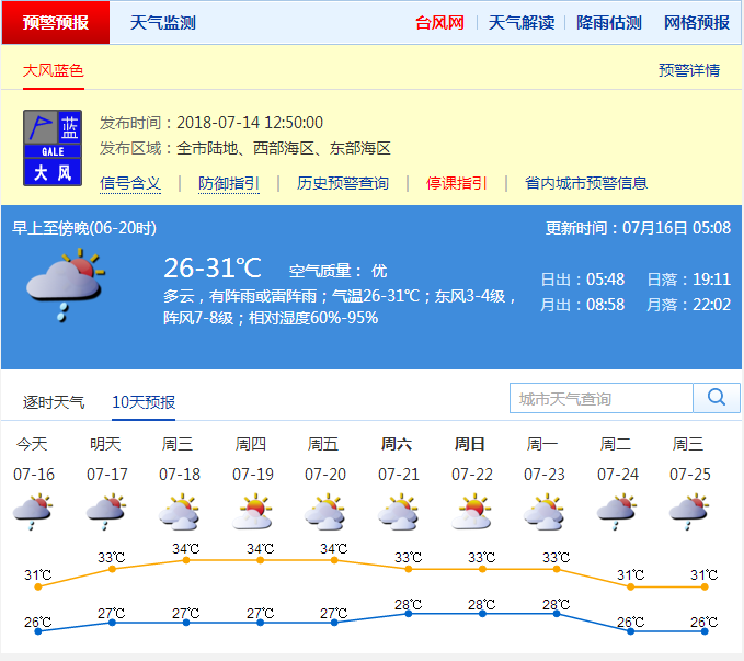 深圳近日降雨天氣增多,16日上午有中到大雨,局部暴雨,伴有7級左右的偏東大風,白天降雨逐漸減弱。預計17日有陣雨,有時降雨頻密,18日陣雨轉多云;展望19日至22日多云到晴天,天氣趨于炎熱。