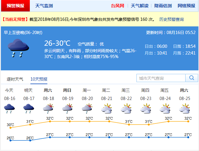 市氣象臺(tái)預(yù)計(jì),8月16日受臺(tái)風(fēng)"貝碧嘉"外圍環(huán)流影響,深圳多間歇性的降雨,局部暴雨;沿海和高地最大陣風(fēng)可達(dá)6至7級。預(yù)計(jì)8月17日有陣雨;8月18日至20日多云有短時(shí)陣雨,天氣趨于炎熱。