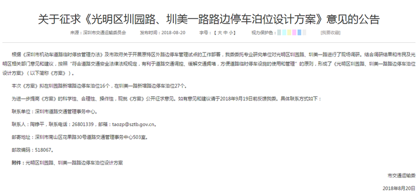 據(jù)介紹,根據(jù)《深圳市機動車道路臨時停放管理辦法》,按照“符合道路交通安全法律法規(guī)規(guī)定,有利于道路交通調(diào)控、緩解交通擁堵,方便道路臨時停車設施的使用和管理”的原則,交通部門制定了《光明新區(qū)圳園路、圳美一路路邊停車泊位設計方案》,擬在圳園路新增路邊停車泊位16個,在圳美一路新增路邊停車泊位27個。