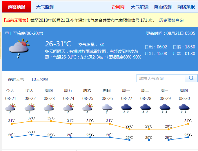 據(jù)深圳氣象臺(tái)預(yù)計(jì),21日~22日,深圳多云,局地易出現(xiàn)雷陣雨,風(fēng)力持續(xù)微弱,部分時(shí)間還有輕霧或霾,能見(jiàn)度較差。其中,21日早晚濕度大,有輕霧,中午以后濕度有所下降,大部分地區(qū)輕霧會(huì)轉(zhuǎn)成輕度灰霾。