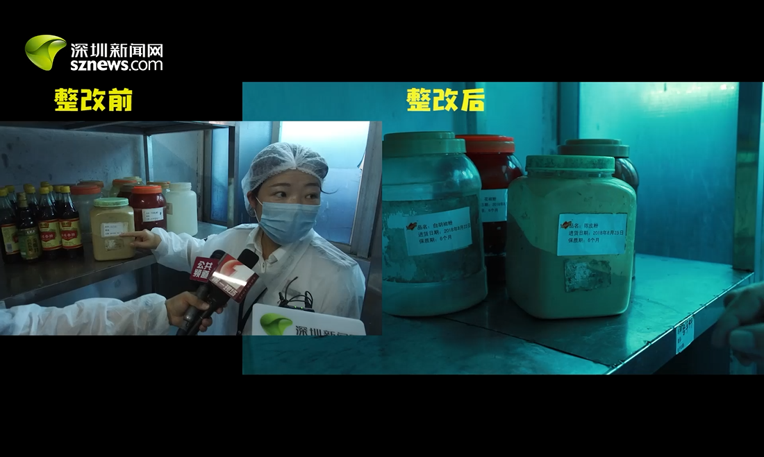 29日突查發(fā)現(xiàn),調配間調料打開后未貼標簽。今日深圳新聞網(wǎng)回訪發(fā)現(xiàn),現(xiàn)已加貼完整標簽,包括品名、進貨日期和有效期等信息。