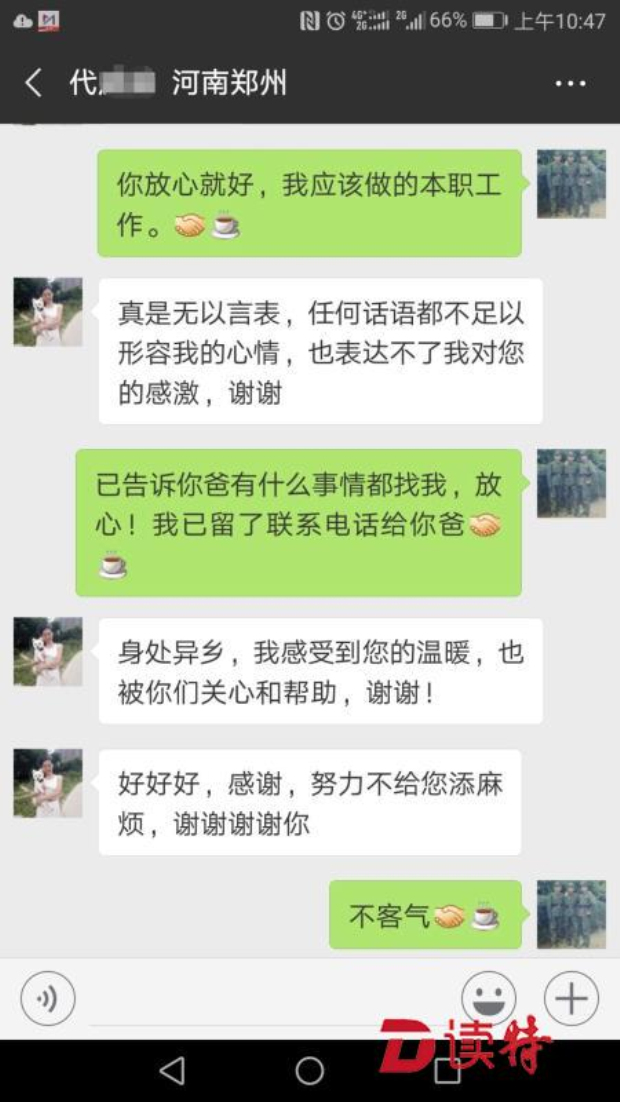 早上7時50分許,口岸派出所巡邏民警陳譚海終于在火車站廣場外的小店中找到了老人,隨即將其接到派出所,隨后由口岸派出所民警晏紅衛(wèi)將其送到轄區(qū)濱河中學(xué)的緊急避難所予以妥善安置,目前老人的身體健康狀況良好,并與其女兒代女士取得了聯(lián)系。