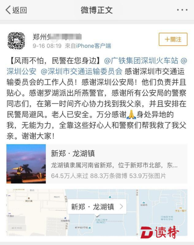 原標(biāo)題:臺風(fēng)天老人坐不上火車,和在河南的女兒失聯(lián)!深圳警方徹夜尋找