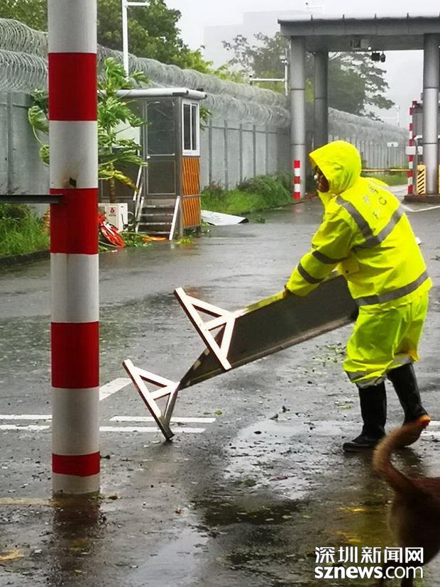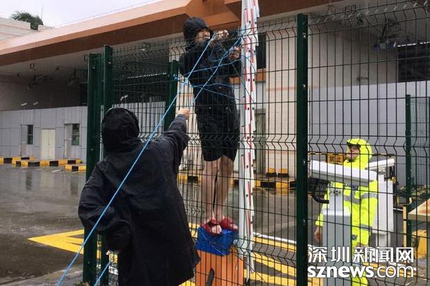 邊檢民警冒雨在拾取被強(qiáng)臺(tái)風(fēng)掀倒現(xiàn)場通關(guān)標(biāo)識(shí)牌