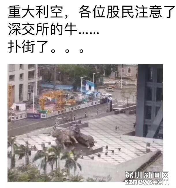 深圳新聞網(wǎng)9月18日訊(記者 張玲 實(shí)習(xí)生歐陽(yáng)子瑜 張林羽  陸宇)關(guān)于“山竹”的各種段子特別多,博君一笑,未必是真。記者18日發(fā)現(xiàn),有一張像素極低的圖在網(wǎng)上流傳,照片中一頭牛雕塑臥倒在地,配文是:重大利空,各位股民注意了,深交所的牛,撲街了……