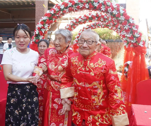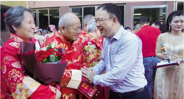 蛇口街道南水社區(qū)居民耿玉璽與王月鳳兩位老人已經(jīng)攜手走過69年,一直有個(gè)遺憾藏在心里——兩人年輕時(shí)沒有舉辦過婚禮,連一張結(jié)婚照片都沒有。日前,二老的遺憾得到彌補(bǔ),愿望得以實(shí)現(xiàn)。南水社區(qū)黨委以開展民生微實(shí)事為契機(jī),為包括耿玉璽與王月鳳夫婦在內(nèi)的社區(qū)15對老年夫婦舉辦了一場別開生面的夕陽美集體金婚慶典活動(dòng)。眾多嘉賓及老人的親朋好友、子女兒孫到場見證,獻(xiàn)上掌聲和祝福。
