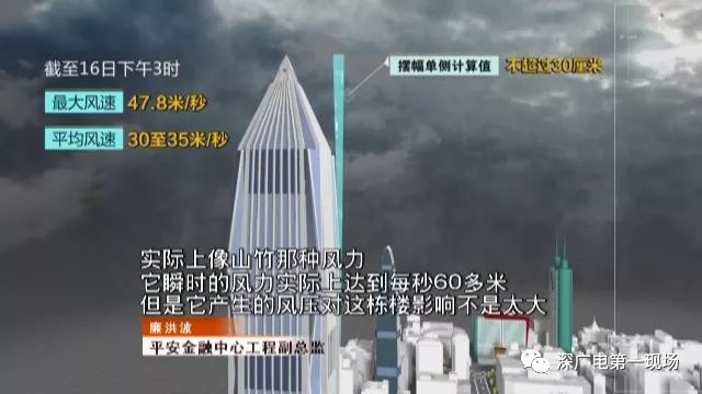 工程人員表示,平安金融中心抗風(fēng)設(shè)計(jì)能應(yīng)對(duì)平均風(fēng)速為60米/秒,陣風(fēng)風(fēng)速最高至80米/秒的臺(tái)風(fēng)。在此模擬情景下,塔頂擺幅單側(cè)計(jì)算值為67厘米。