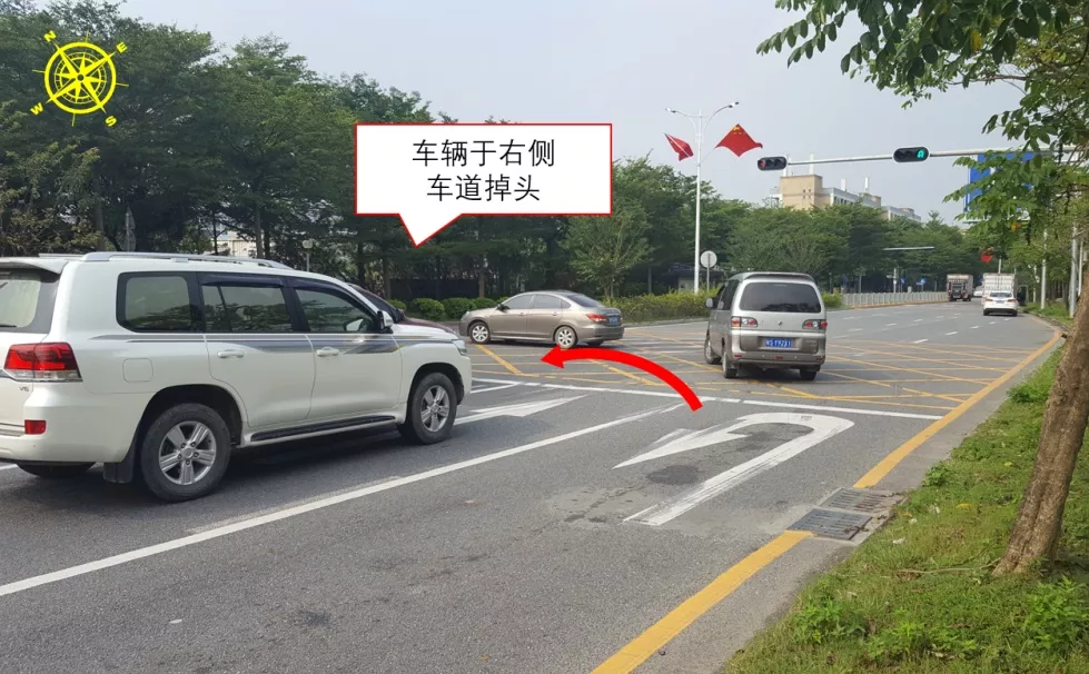 福鳳/騰豐三路口東側(cè)為鳳凰山旅游區(qū),通勤車流較多?,F(xiàn)狀路口未設(shè)置紅綠燈,人車交織嚴(yán)重,交通秩序混亂,易發(fā)交通事故。9月14日,深圳交警啟用福鳳/騰豐三路口信號燈。為解決掉頭車轉(zhuǎn)彎半徑不足問題,進一步在距路口約96米處開設(shè)掉頭口,并以最外側(cè)車道作為掉頭車道,同時與福鳳/騰豐三路口實施聯(lián)動設(shè)置燈控掉頭。該路口是寶安首個“一機兩控”+外側(cè)掉頭微創(chuàng)新路口。