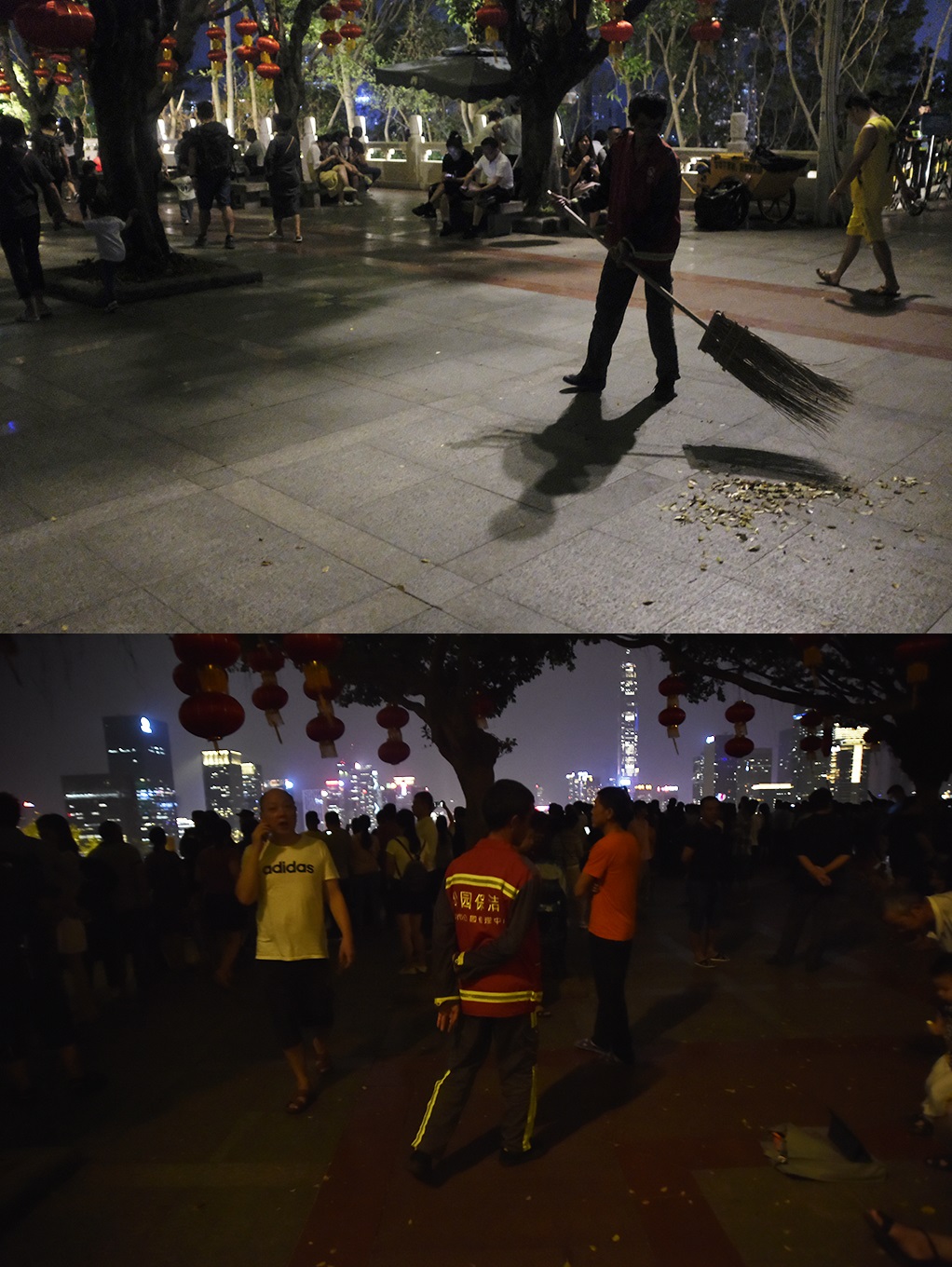 10月8日晚,蓮花山觀景臺的看燈人潮并沒有燈光秀首秀那一天洶涌,燈光表演過后,只有兩名清潔工人留下來進(jìn)行垃圾清掃?!敖裢砝?。”負(fù)責(zé)蓮花山觀景臺區(qū)域的環(huán)衛(wèi)工人告訴記者,“我們在燈光秀期間看到垃圾就會及時清理,一般散場之后一個小時是清掃時間,但今天這個工作很快就完成了,深圳人素質(zhì)還是很高的,基本很少有人會亂丟垃圾?!?/p>