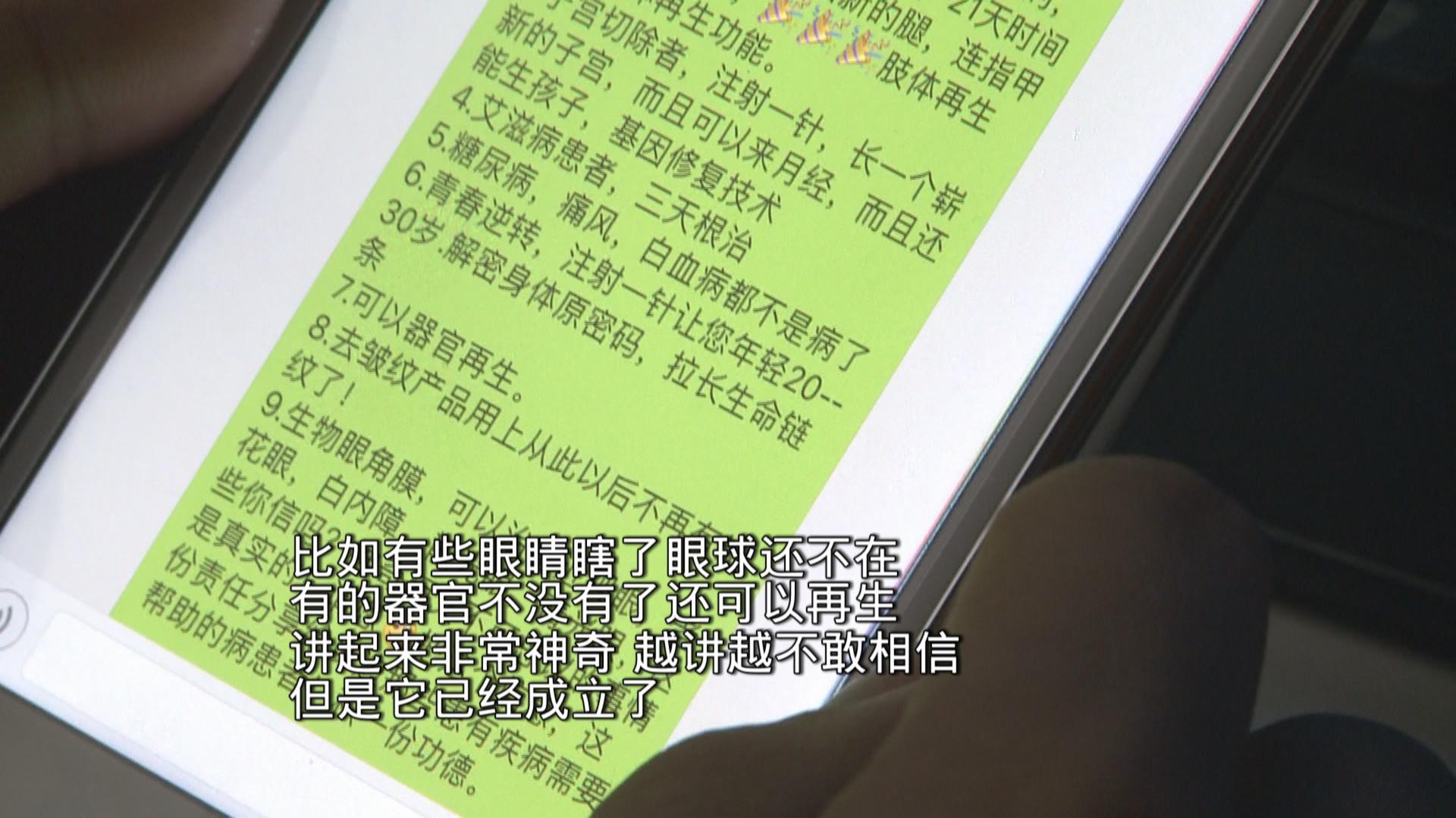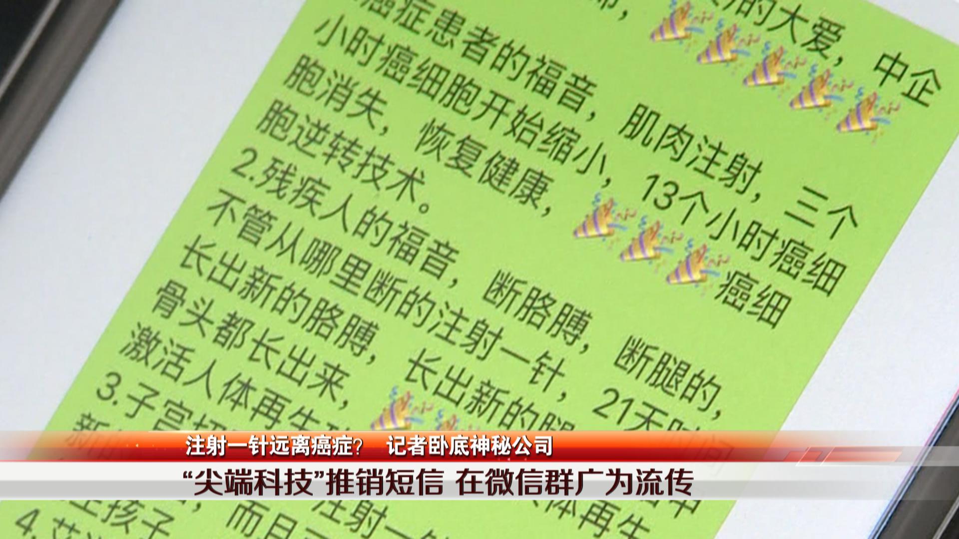 “先機(jī),先機(jī),改變?nèi)祟?lèi)命運(yùn)的生物科技”,這條號(hào)稱(chēng)改變患者命運(yùn)的短信在一些微信群里流轉(zhuǎn),短信內(nèi)容號(hào)稱(chēng)只要打一針,就能治愈身體上所有的疾病,其中包括癌癥、肢體再生、子宮再生、糖尿病、青春逆轉(zhuǎn)等,還呼吁將短信轉(zhuǎn)給有需要的患者,并表示向全國(guó)招募合伙人。