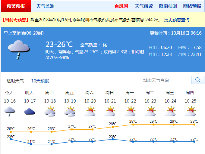受弱冷空氣和切變線(xiàn)共同影響,16日深圳陰天有中到大雨,局部暴雨,伴有零散雷暴和5~6級(jí)陣風(fēng)。預(yù)計(jì)降雨將在中午前后減弱,氣溫下降3 ℃~4 ℃,最低氣溫低至21 ℃,最高氣溫在25 ℃左右。17日陰天間多云,偶有零星小雨,氣溫在21 ℃ ~26 ℃。18日起轉(zhuǎn)為多云到晴天,早晚清涼,空氣干燥。